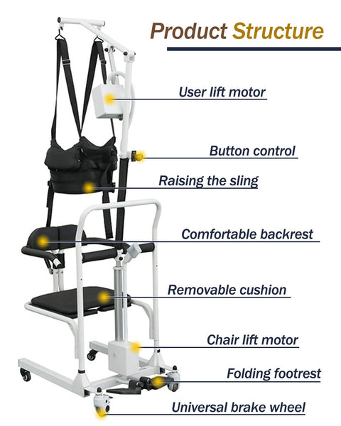 【Motor Driving Lifting + Sling System】Adjustable lift motor allows you to adjust the upper body and seat height effortlessly. After charging for 3 hours, the motor can be used for more than 15 days. The sling system is flexible and free to disassemble, allowing you to live as safely and comfortably as possible. The large sling size accommodates patients of all sizes. Easily transfer and suitable for various scenarios.